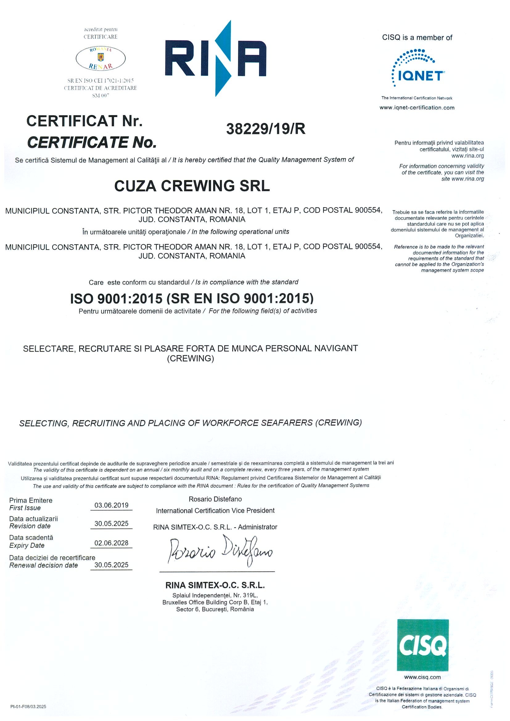 Our quality management system is certified by RINA, a globally recognized classification and certification body. This ISO 9001:2015 certification reflects our dedication to consistent service excellence, continuous improvement, and client satisfaction, demonstrating our structured approach to managing processes and delivering reliable crewing solutions.