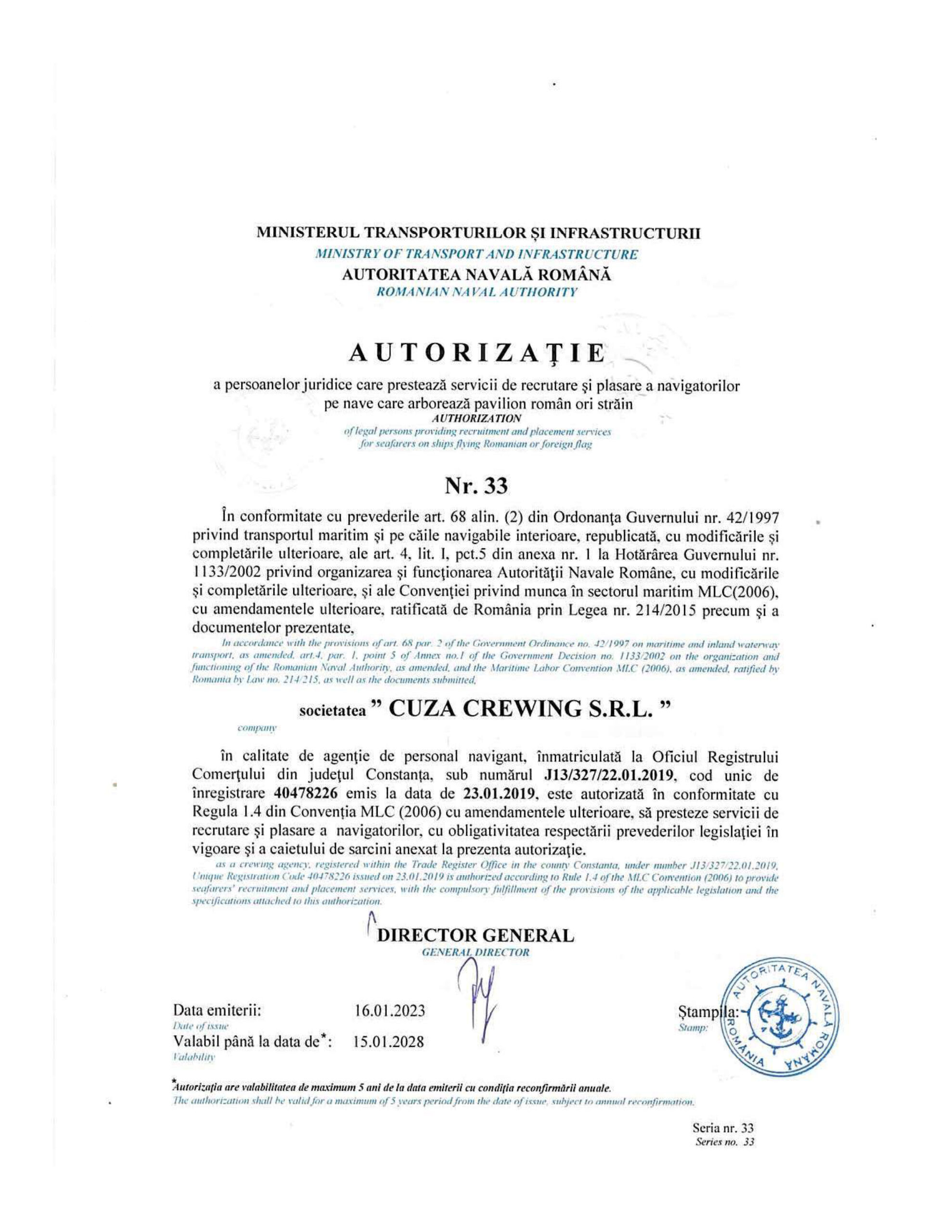 Cuza Crewing is officially accredited by the Romanian Naval Authority, ensuring full compliance with national maritime regulations and standards. This certification affirms our commitment to safety, crew welfare, and operational integrity in all our crewing activities.